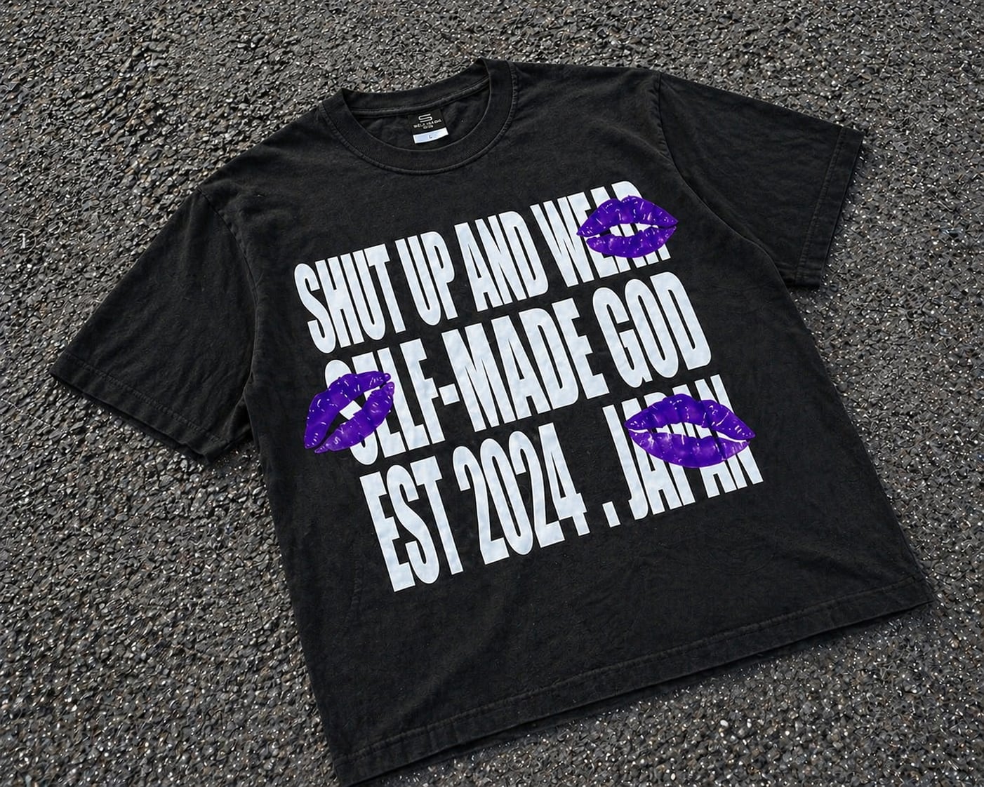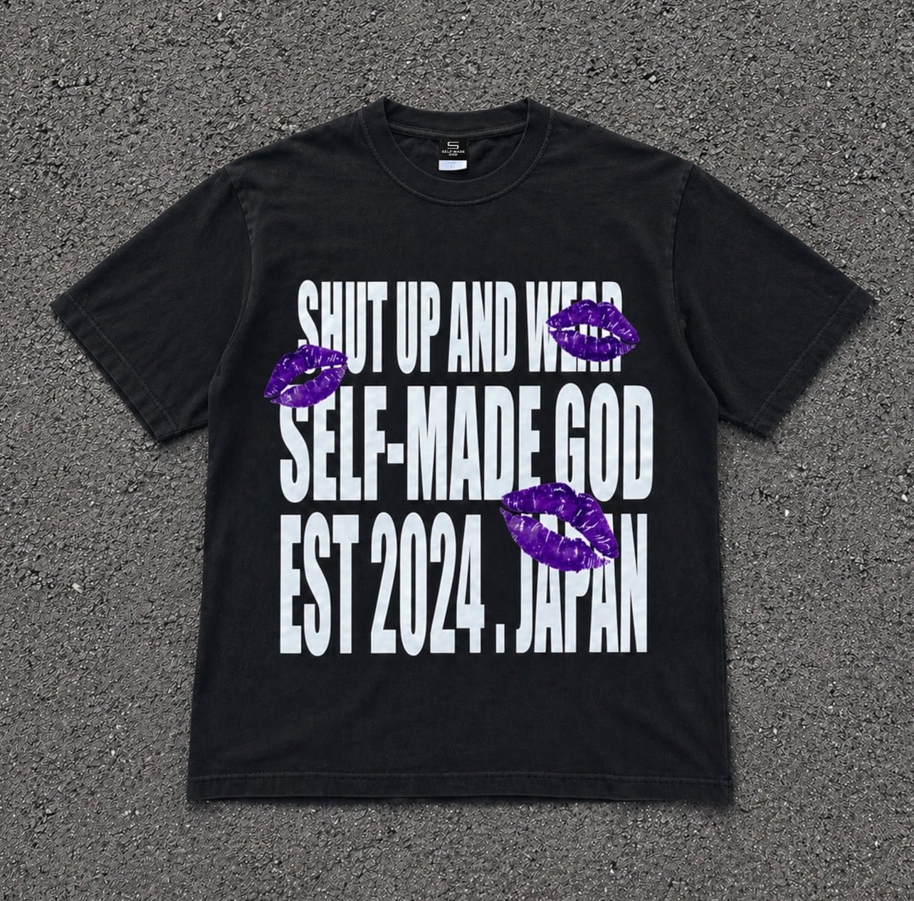 このTシャツは**「SHUT UP AND WEAR SELF-MADE GOD EST 2024 . JAPAN」**という英語のメッセージがプリントされており、日本語に訳すと 「黙ってSELF-MADE GODを着ろ」 という意味になります。