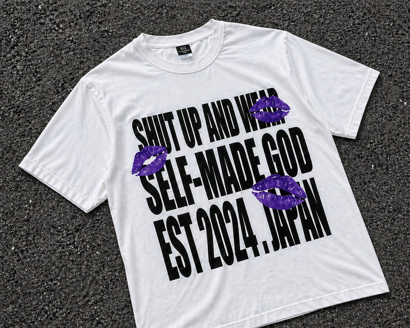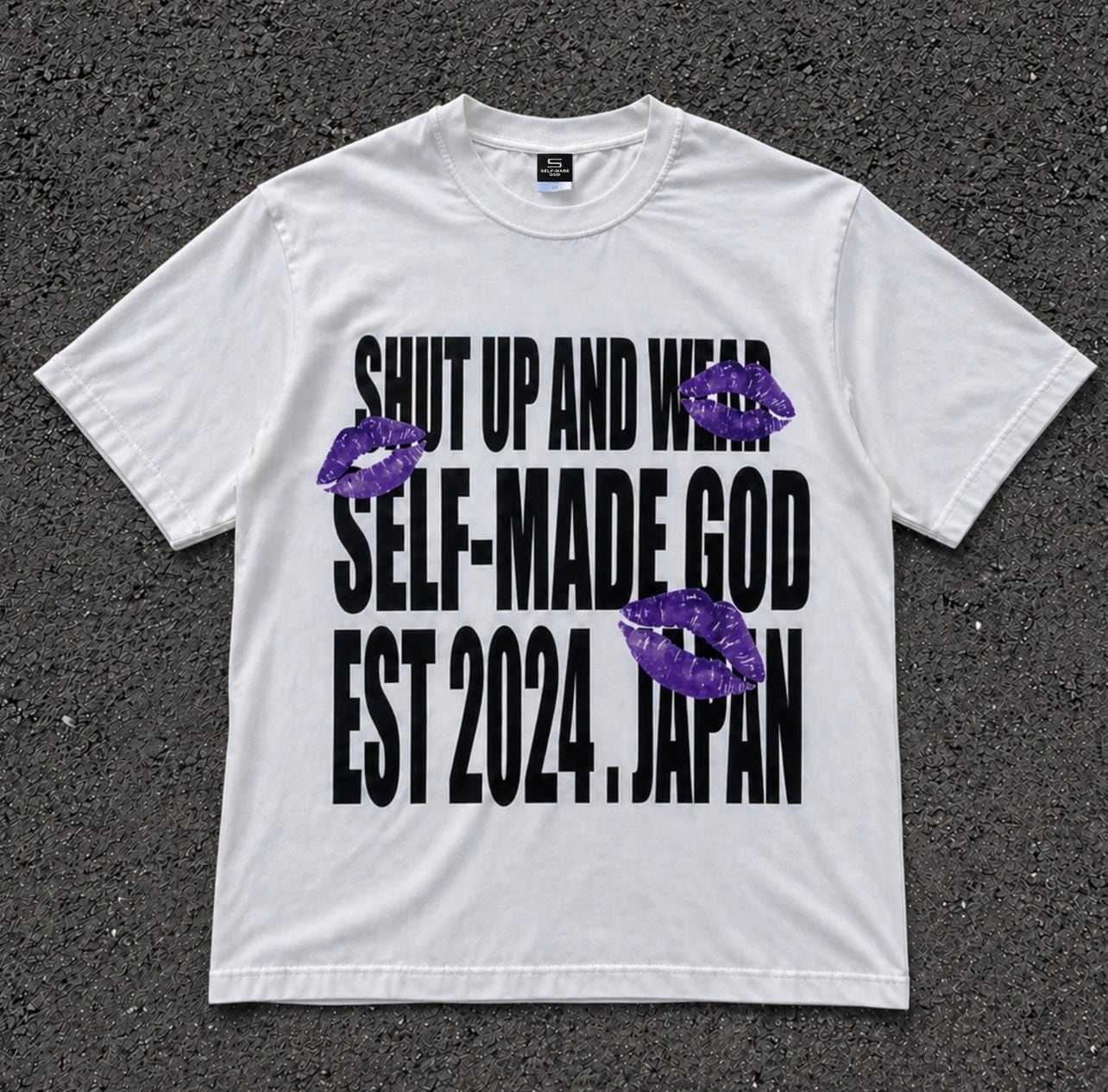 このTシャツは**「SHUT UP AND WEAR SELF-MADE GOD EST 2024 . JAPAN」**という英語のメッセージがプリントされており、日本語に訳すと 「黙ってSELF-MADE GODを着ろ」 という意味になります。